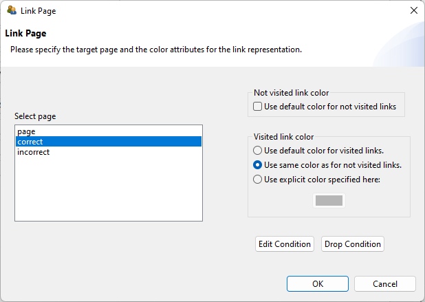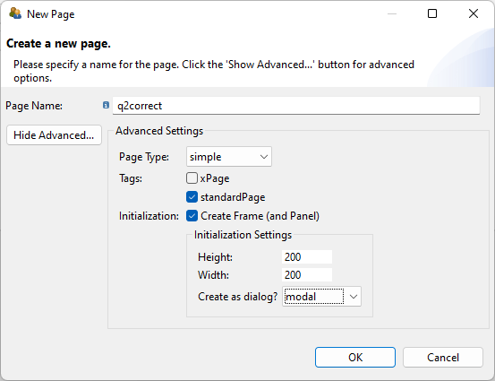 q2correct to give feedback about a correct response and define the page as modal dialog.HTMLTextField with a feedback text.OK button and link the command CLOSE.txtQ2 for the SingleLineInputField next to Q2.
