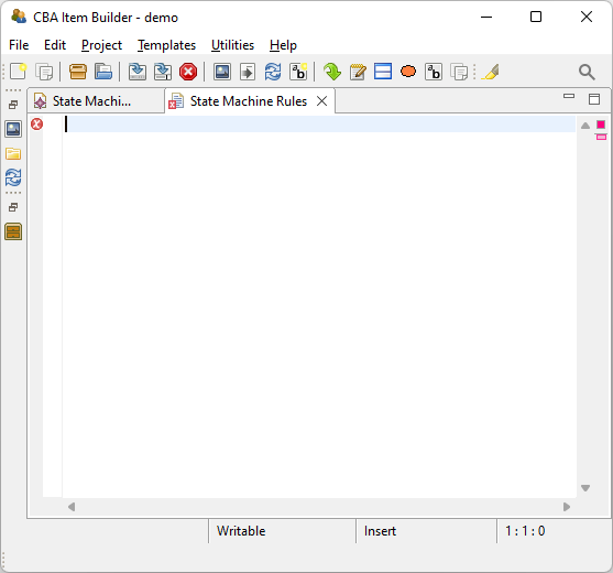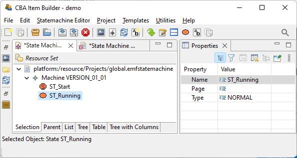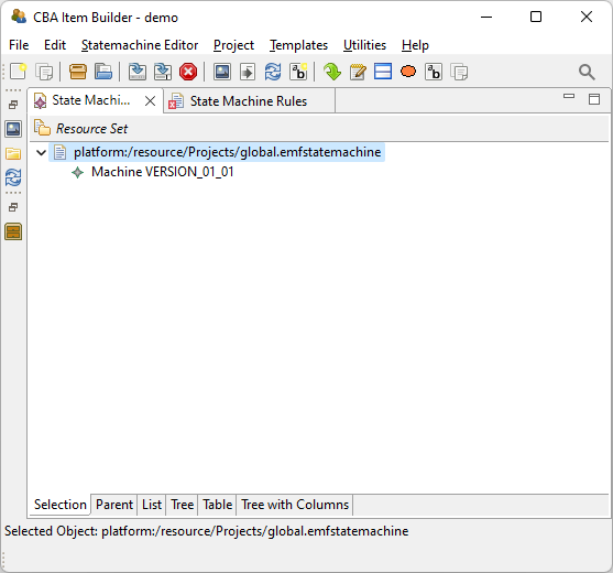 The CBA ItemBuilder’s user-interface for Finite-State Machines consists of two editors: The State Machine Tree View and the State Machine Rules Editor (open both with menu Project > Edit State Machine).