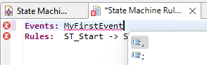 Changes in the State Machine Rules Editor and in the State Machine Tree View are confirmed by closing the editor. After defining States or Events, close both editors to make sure the model is updated!