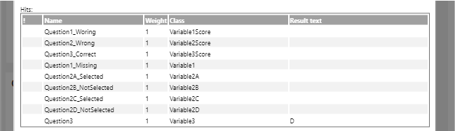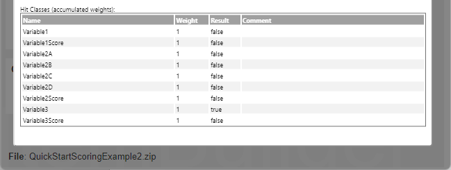For developing and testing Scoring rules, the Preview provides the Scoring Debug Window that lists the Names of the active hit (=Categorical value) for each Class (=Variable) and, if provided, the Result Text (=Non-categorical value).