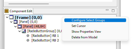 If components are perfectly nested, the outer components can only be selected via the Component Edit view. For instance, the dialog Configure Select Groups can only be opened using the context-menu of the Frame component.